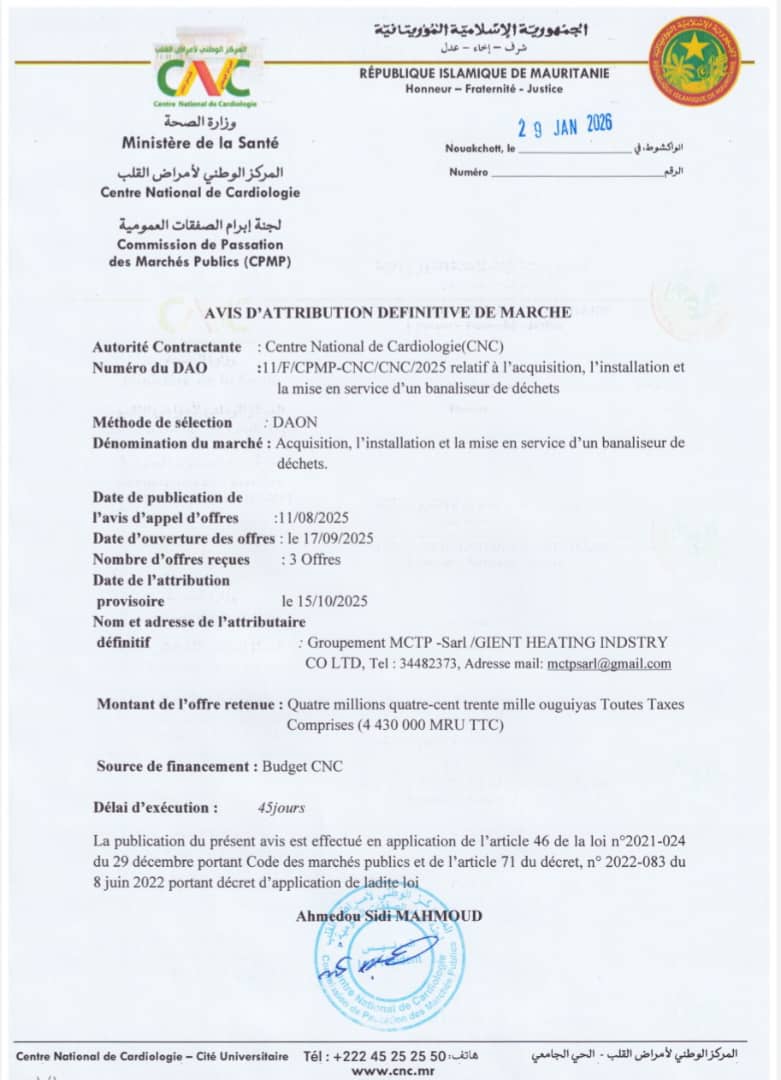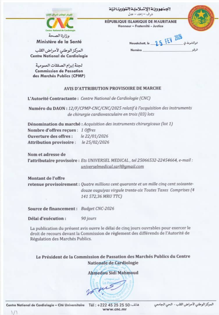 Nouakchott, 25/02/2026 – Le Centre National de Cardiologie a annoncé l’attribution provisoire du marché n° 12/F/CPMP-CNC/CNC/2025, relatif à l’acquisition d’instruments de chirurgie cardiovasculaire, dans le cadre de l’exécution du budget de l’année 2026.