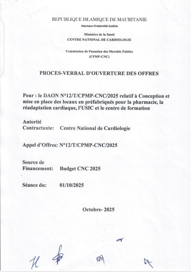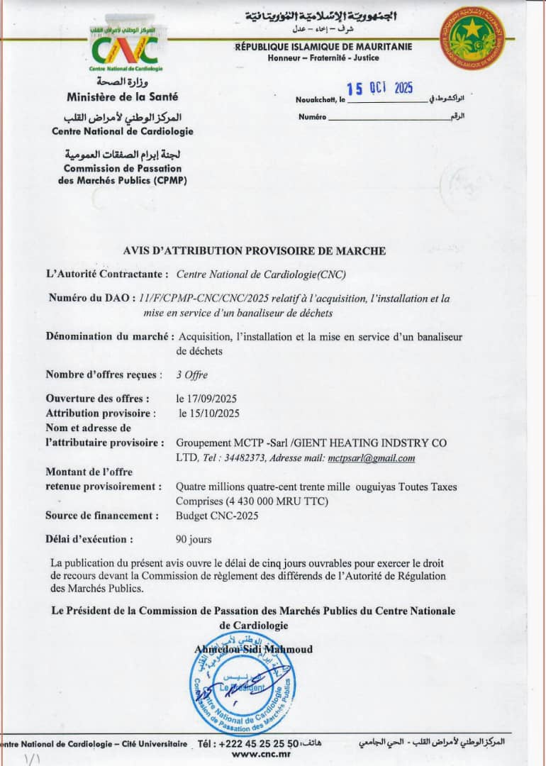 Nouakchott, 15 octobre 2025 – Le Centre National de Cardiologie (CNC) a annoncé l’attribution provisoire d’un marché relatif à l’acquisition, l’installation et la mise en service d’un banaliseur de déchets hospitaliers. Cette décision fait suite à l’appel d’offres n°11/F/CPMP-CNC/CNC/2025, qui a suscité l’intérêt de trois soumissionnaires.