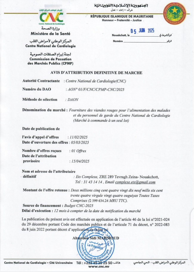 نواكشوط، 29 مايو 2025 – أعلن المركز الوطني لأمراض القلب (CNC) عن المنح المؤقت لصفقة تتعلق بـتوفير المواد الغذائية القابلة للتخزين، الموجهة لتغذية المرضى والطواقم الطبية المناوبة، وذلك في إطار صفقة بطلبات.