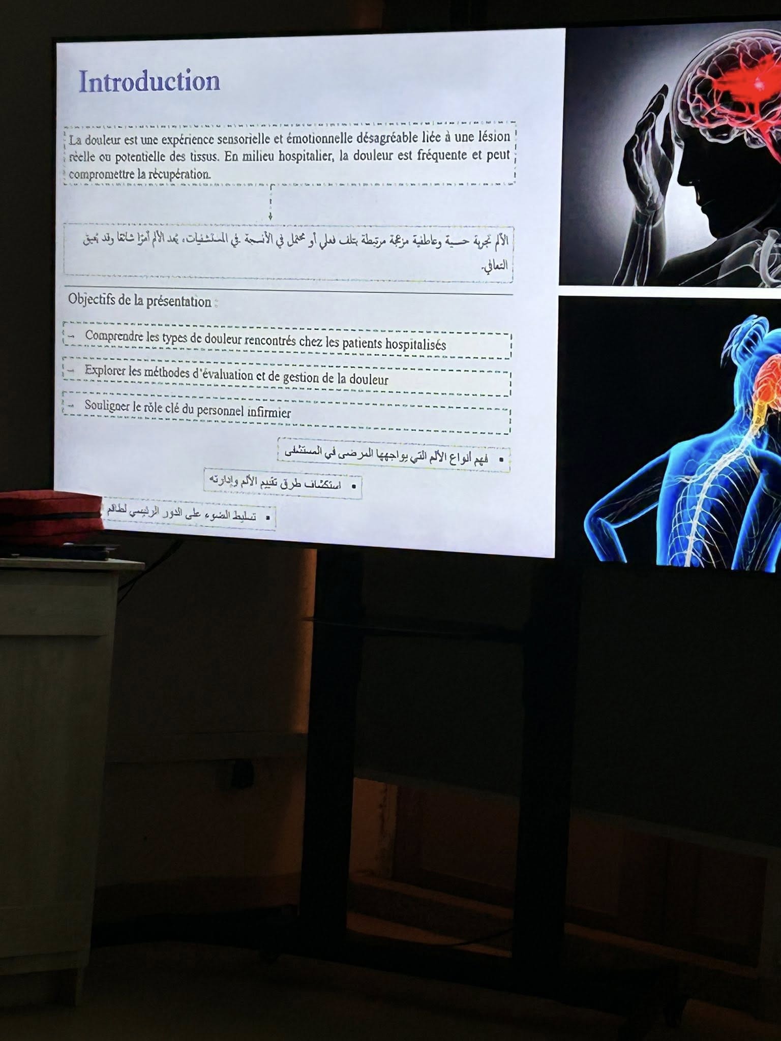 وتضمنت العروض مداخلة للممرضة خدجة محمد بوساتي حول دور الممرض في المستشفى النهاري، إضافة إلى عرض آخر للممرض المختار ولد اطفيل تناول موضوع تقييم الألم وتدبيره لدى المرضى.